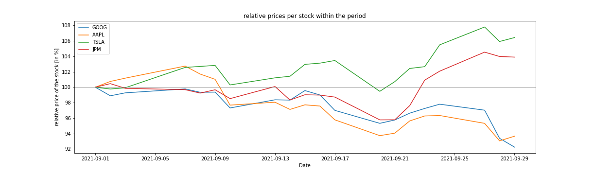 Figure 2: Comparison of the price trend in relative values for the four stocks.