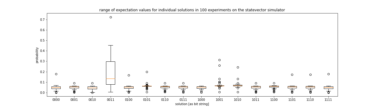 We have executed 100 experiments for the given problem. Figure 3 shows, that we have a high probability to measure the correct result after executing Grover Adaptive Search. However, we have to admit, that we executed the experiments only on the state vector simulator and not on current hardware. This has two reasons: First, we already need for this small problem 12 fully connected qubits in a quantum computer and second, the current quantum computers are not able to execute quantum circuits with such a high depth (meaning the number of gates executed on one qubit).