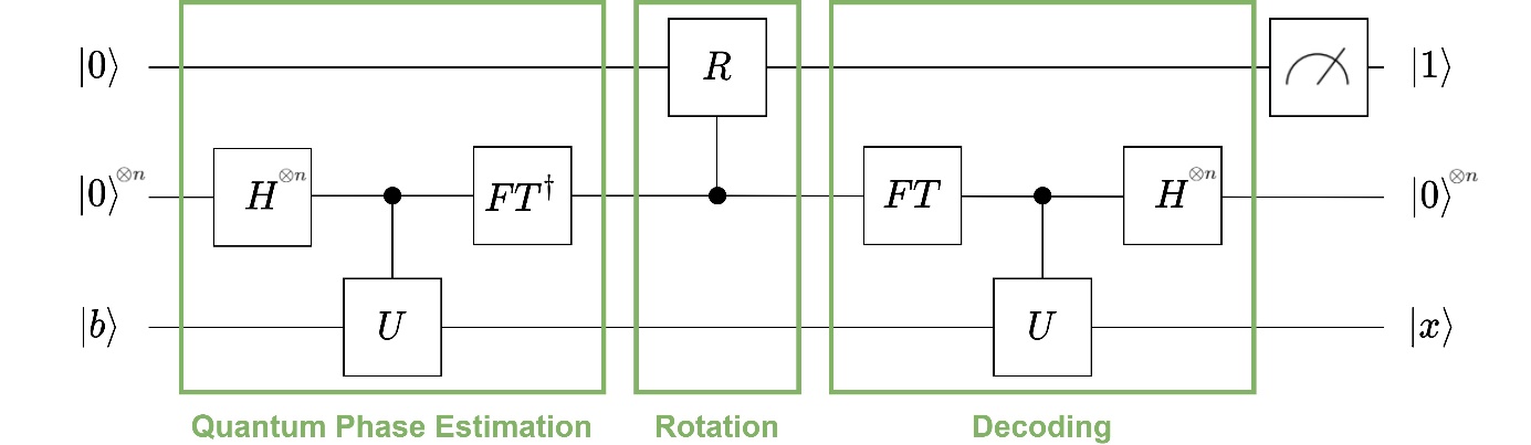 and is easy to invert. Figure 1 shows the three steps of the HHL algorithm: At first, the eigenvalues are determined using the Quantum Phase Estimation (QPE) [2] with the unitary