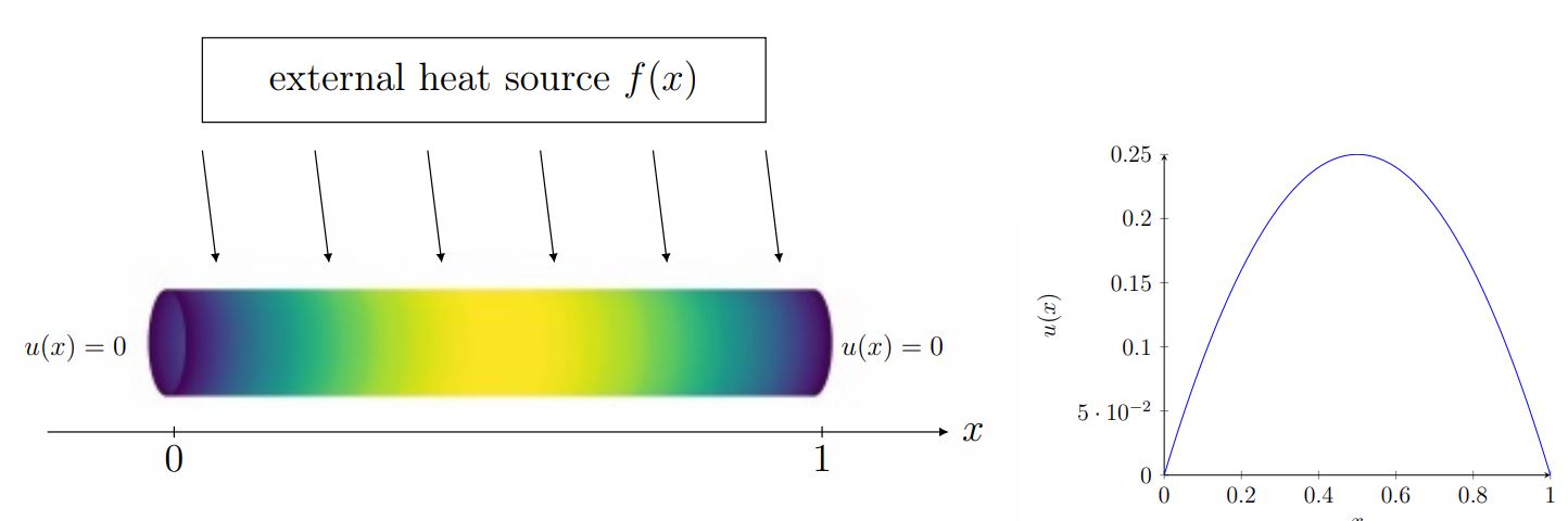 There are several reasons why the FEM is a promising field of application for QLSA. On the one hand the large systems turning up in the FEM are generated algorithmically instead of directly being the input which avoids a need to access the data via quantum RAM [3]. On the other hand, the system assembling leads to sparse system matrices that are an important requirement when it comes to quantum speedup using a QLSA. Dependent on the specific application task, implementing a QLSA as part of the FEM routine allows potential polynomial speedups [4]. In the following, we refer to a simple 1D-setup as we consider a thin, cylindrical rod of length