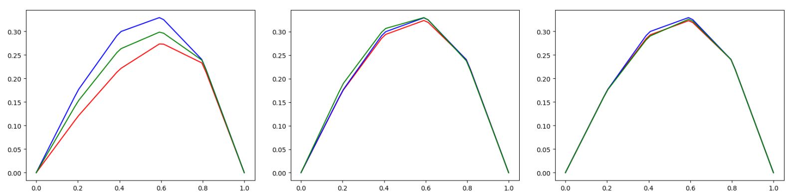 Figure 3: Increasing approximation quality of the quantum solution when providing more qubits for the HHL-circuit (Quantum Simulators and the expected curve (green) visualised)