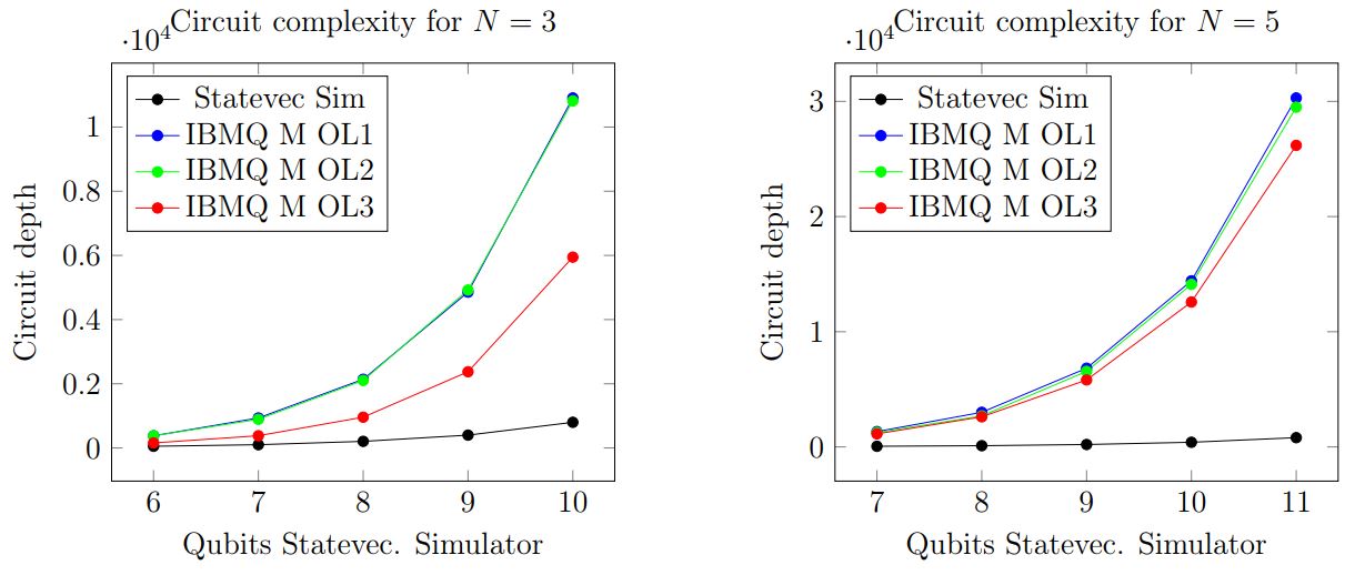 Figure 4: Deployment of the quantum circuit complexity at an increasing number of used qubits using different optimization levels for transpiling